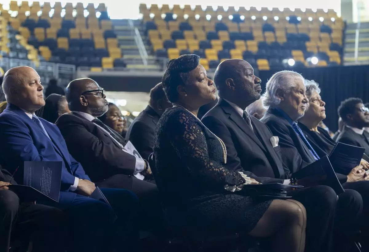 New Orleans Mayor Latoya Cantrell, center, sits next to former New Orleans mayors, Mitch Landrieu, far left, and Sidney Barthelemy, far right in blue shirt, at the Celebration of Life for Sybil Haydel Morial at Xavier University of Louisiana, Monday, Sept. 23, 2024, in New Orleans. (Chris Granger/The Times-Picayune/The New Orleans Advocate via AP)