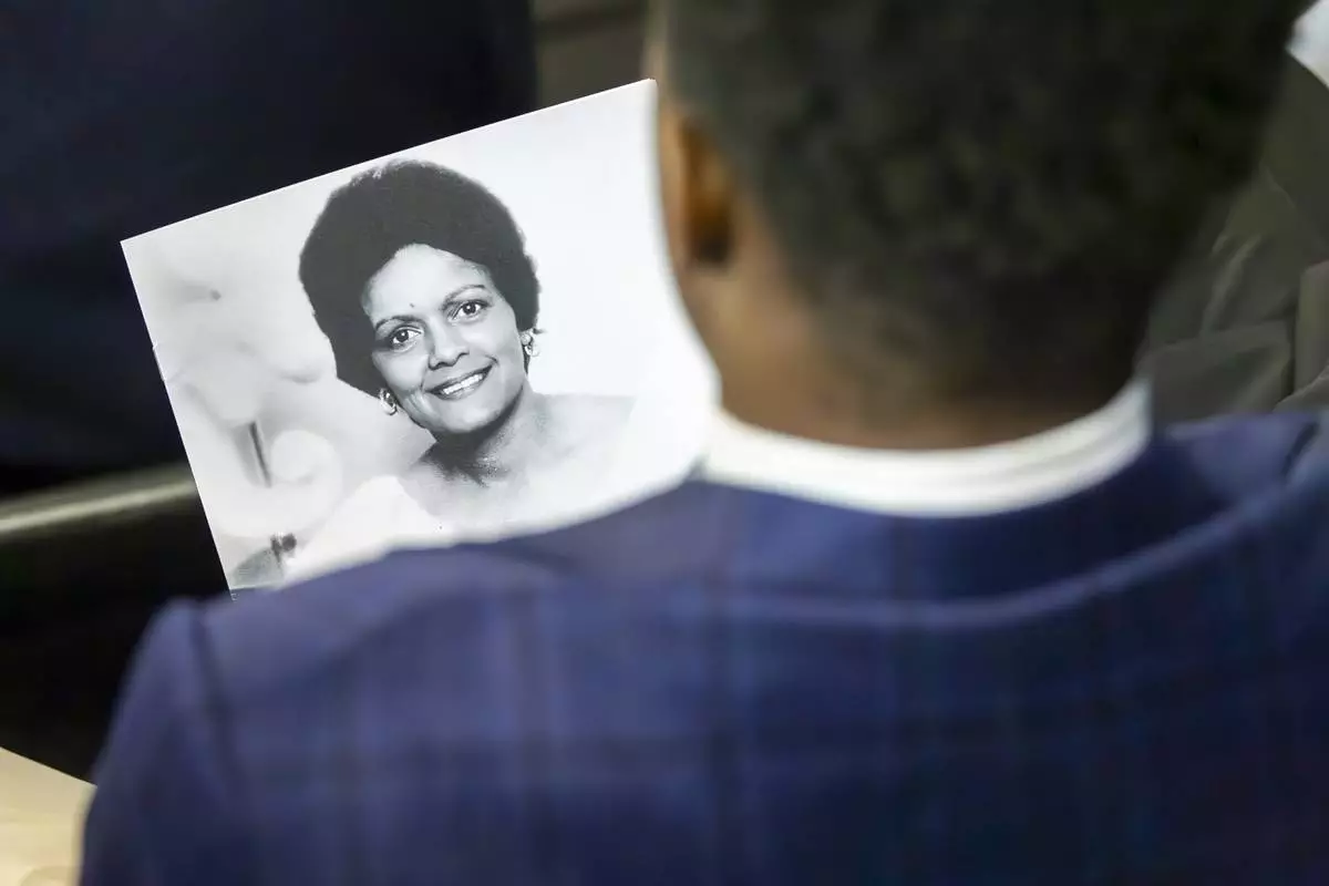 A photo of former New Orleans Mayor Ernest "Dutch" and his wife, Sybil Haydel Morial, greets family and guests at Xavier University of Louisiana for a Celebration of Life for Morial, Monday, Sept. 23, 2024, in New Orleans. (Chris Granger/The Times-Picayune/The New Orleans Advocate via AP)