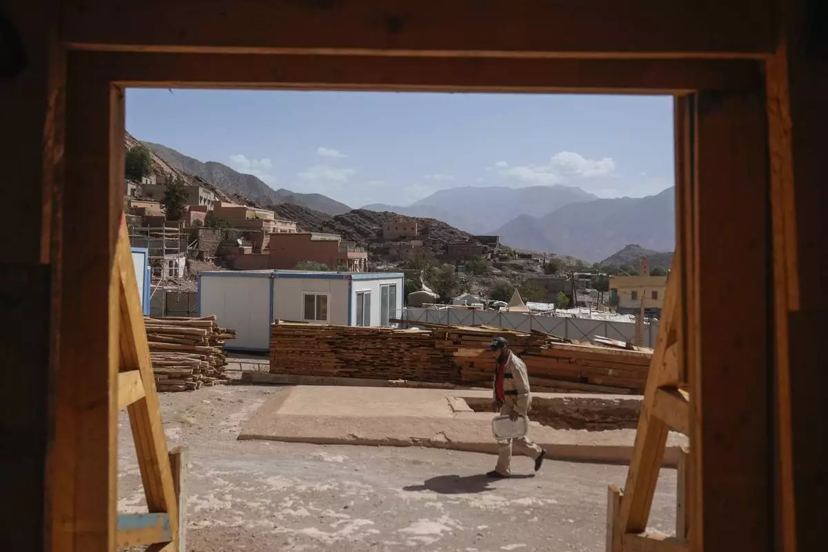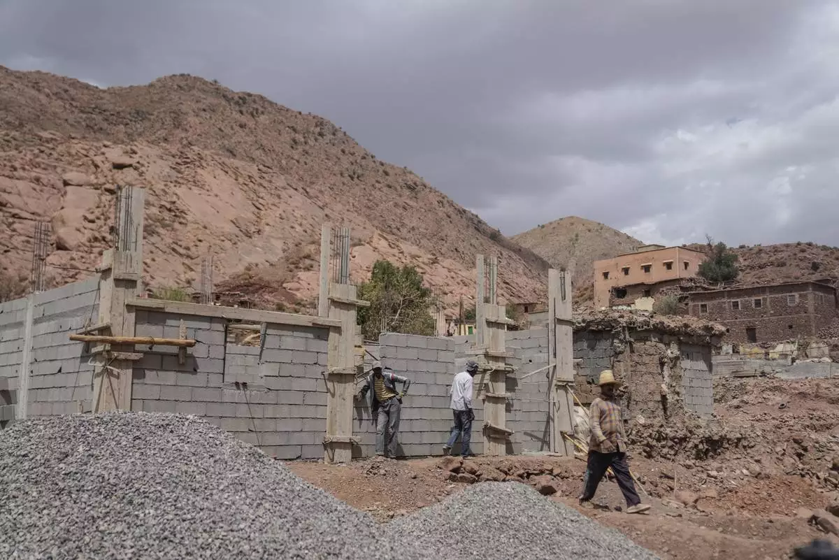 Construction workers build a house in the Atlas mountain village of Tinmel, Morocco, Thursday, Sept. 5, 2024, which was significantly hit during a 2023 earthquake. (AP Photo/Mosa'ab Elshamy)