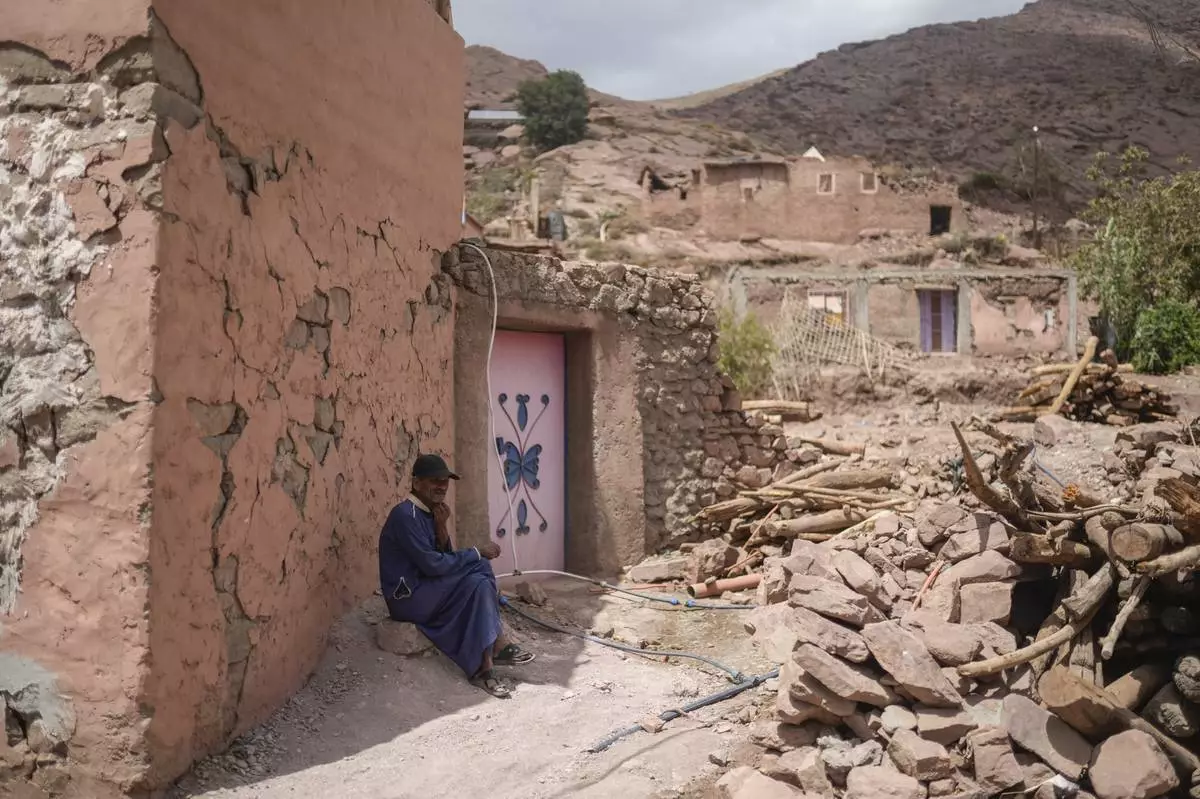 A man sits outside a home which was damaged in a 2023 earhquake, Thursday, Sept. 5, 2024, in the Atlas village of Tinmel, outside of Marrakech, Morocco. (AP Photo/Mosa'ab Elshamy)