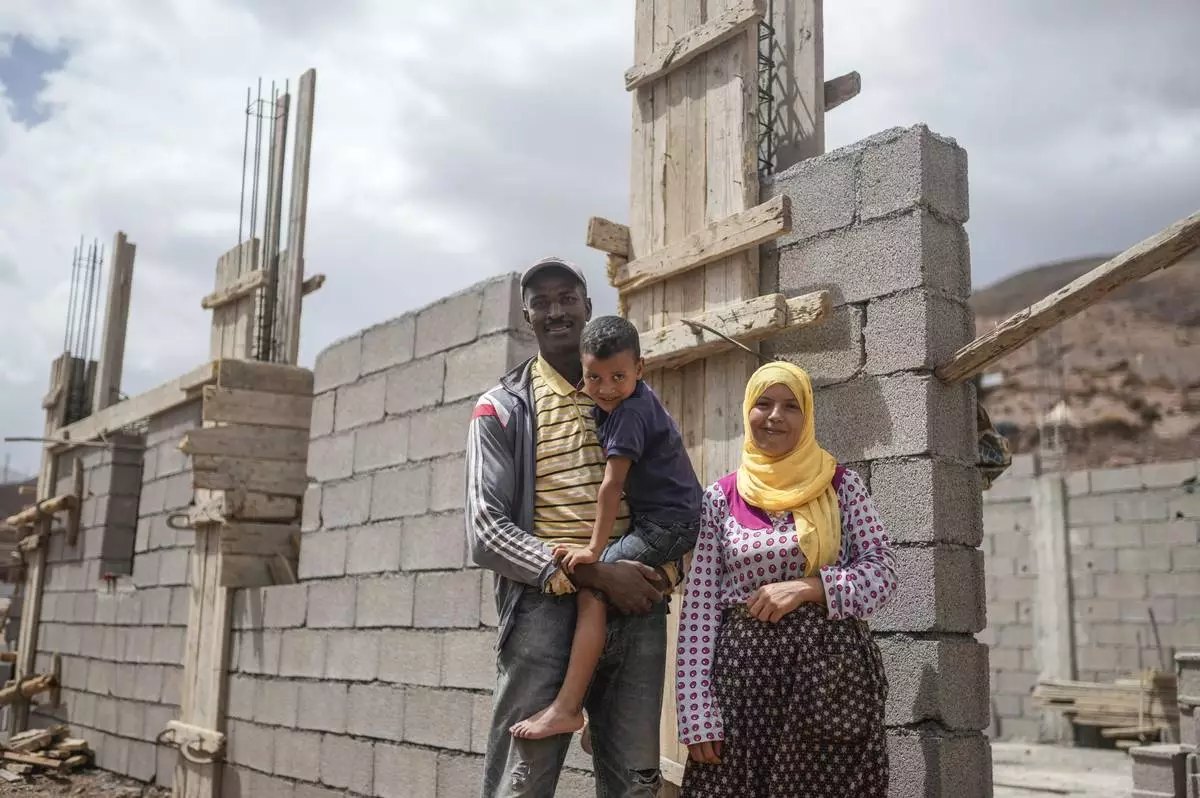 Redwan Ait Salah stands with his son, Tarik, and wife, Khadija Diwan, outside a house they are building, after their home was destroyed in a 2023 earthquake, in the Atlas mountain village of Tinmel, outside of Marrakech, Morocco, Thursday, Sept. 5, 2024. (AP Photo/Mosa'ab Elshamy)