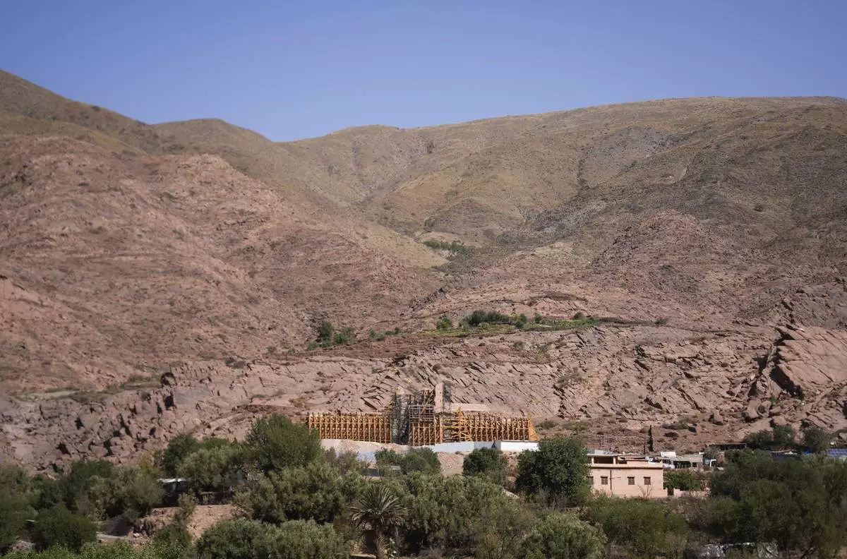 A wooden structure supports the Great Mosque of Tinmel which dates back to the 12th century and suffered significant damage during a 2023 earthquake, in the Atlas mountain village of Tinmel, outside of Marrakech, Morocco, Thursday, Sept. 5, 2024. (AP Photo/Mosa'ab Elshamy)