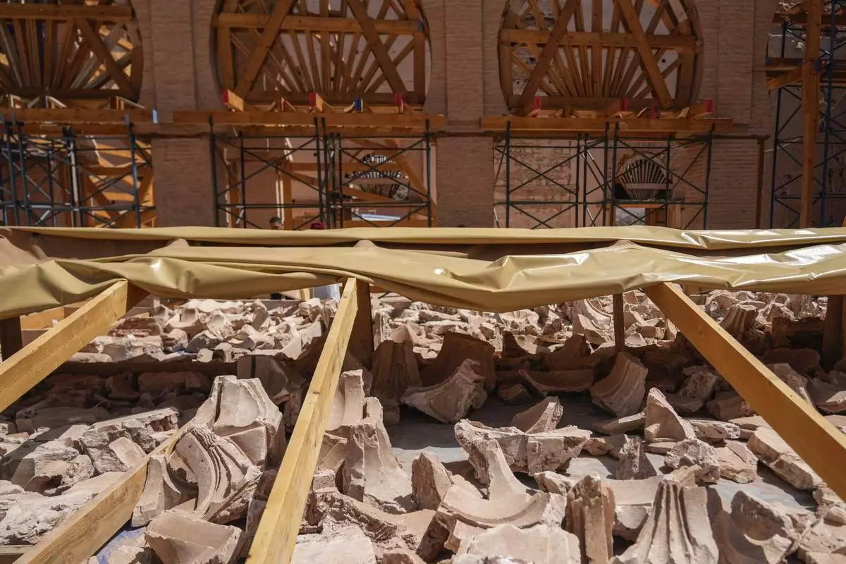 A construction worker unveils recovered pieces from the Great Mosque of Tinmel, which dates back to the 12th century and suffered significant damage during a 2023 earthquake, in the Atlas mountain village of Tinmel, outside of Marrakech, Morocco, Thursday, Sept. 5, 2024. (AP Photo/Mosa'ab Elshamy)