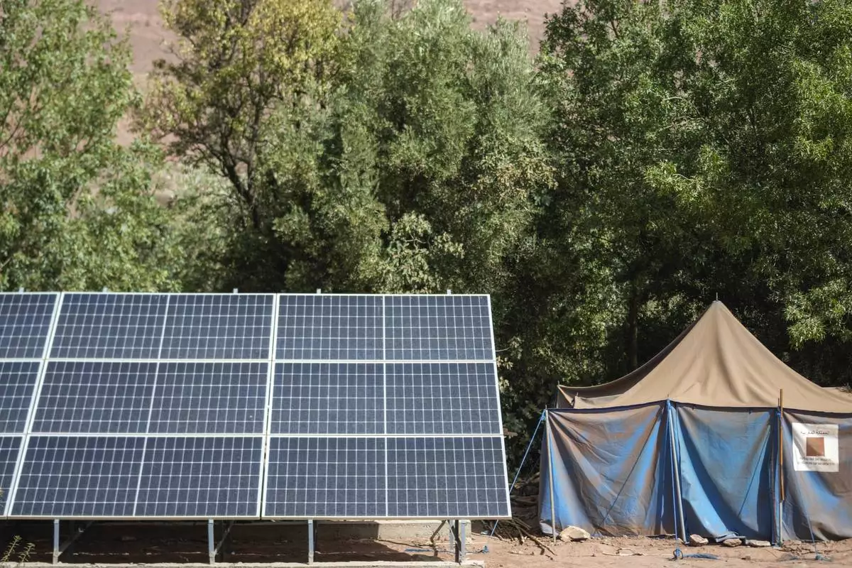 A tent for people displaced by the 2023 earthquake sits next to solar panels, in the Atlas mountain village of Tinmel, outside of Marrakech, Morocco, Thursday, Sept. 5, 2024. (AP Photo/Mosa'ab Elshamy)