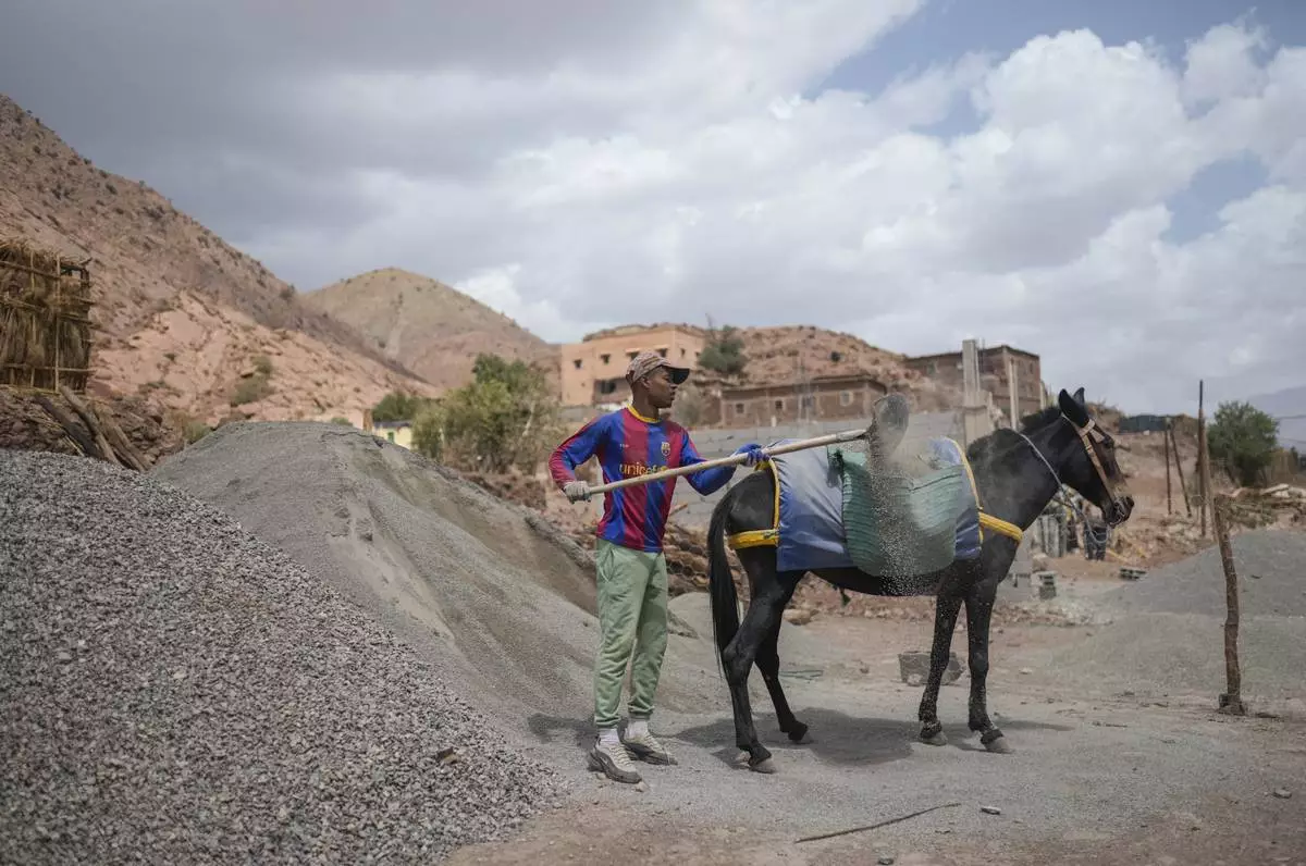 A worker transports construction material on a mule in the village of Tinmel, which suffered significant damage in a 2023 earthquake, in the Atlas mountain village of Tinmel, outside of Marrakech, Morocco, Thursday, Sept. 5, 2024. (AP Photo/Mosa'ab Elshamy)