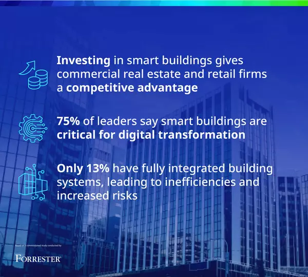 - 75% of commercial real estate and retail leaders say smart buildings are important to accelerating digital transformation efforts