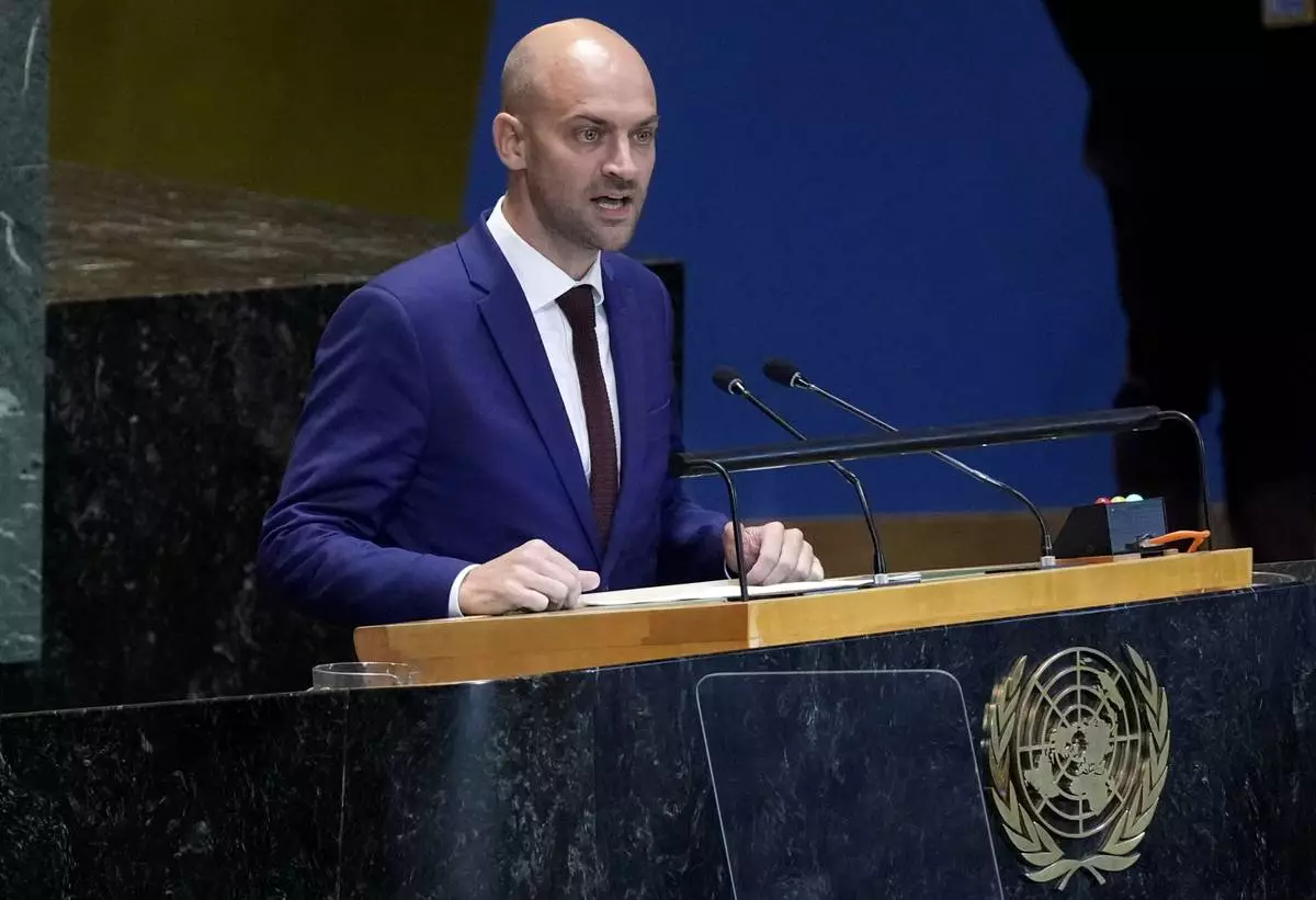 France's Foreign Minister Jean-Noel Barrot addresses the Summit of the Future, in the United Nations General Assembly, Monday, Sept. 23, 2024. (AP Photo/Richard Drew)