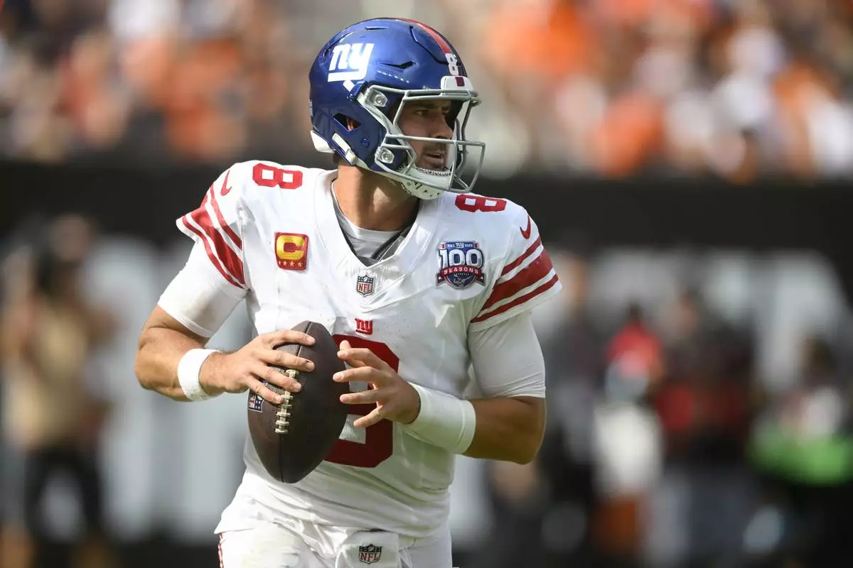 New York Giants quarterback Daniel Jones rolls out to pass against the Cleveland Browns during the second half of an NFL football game, Sunday, Sept. 22, 2024, in Cleveland. (AP Photo/David Richard)