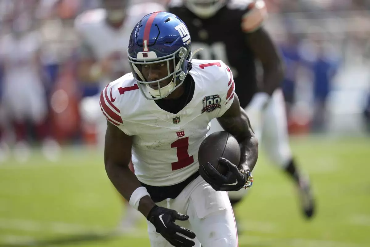 New York Giants wide receiver Malik Nabers (1) runs against the Cleveland Browns during the first half of an NFL football game, Sunday, Sept. 22, 2024 in Cleveland. (AP Photo/Sue Ogrocki)