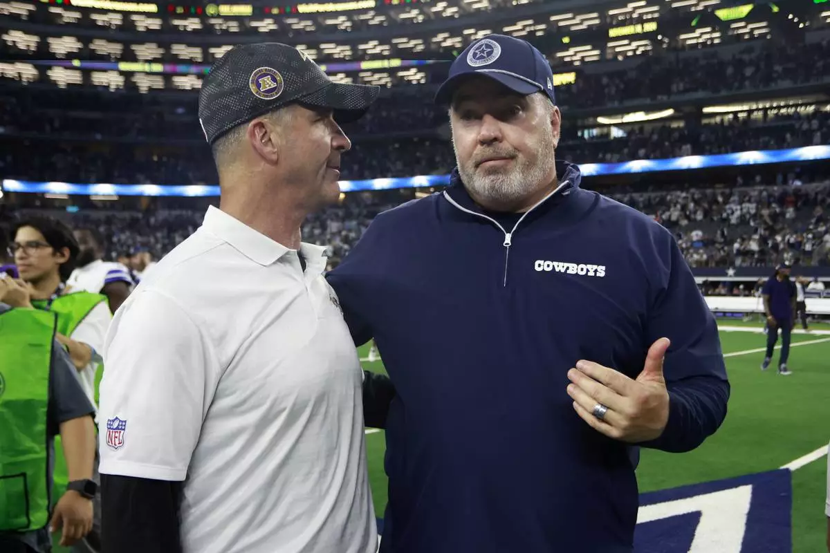 Baltimore Ravens head coach John Harbaugh, left, and Dallas Cowboys head coach Mike McCarthy, right, greet each other after the team's NFL football game in Arlington, Texas, Sunday, Sept. 22, 2024. (AP Photo/Gareth Patterson)