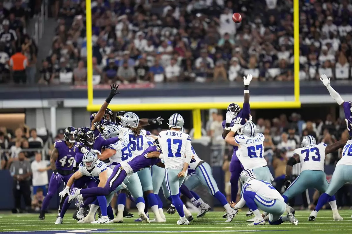 Dallas Cowboys place kicker Brandon Aubrey (17) kicks a field goal in the first half of an NFL football game against the Baltimore Ravens in Arlington, Texas, Sunday, Sept. 22, 2024. (AP Photo/Julio Cortez)