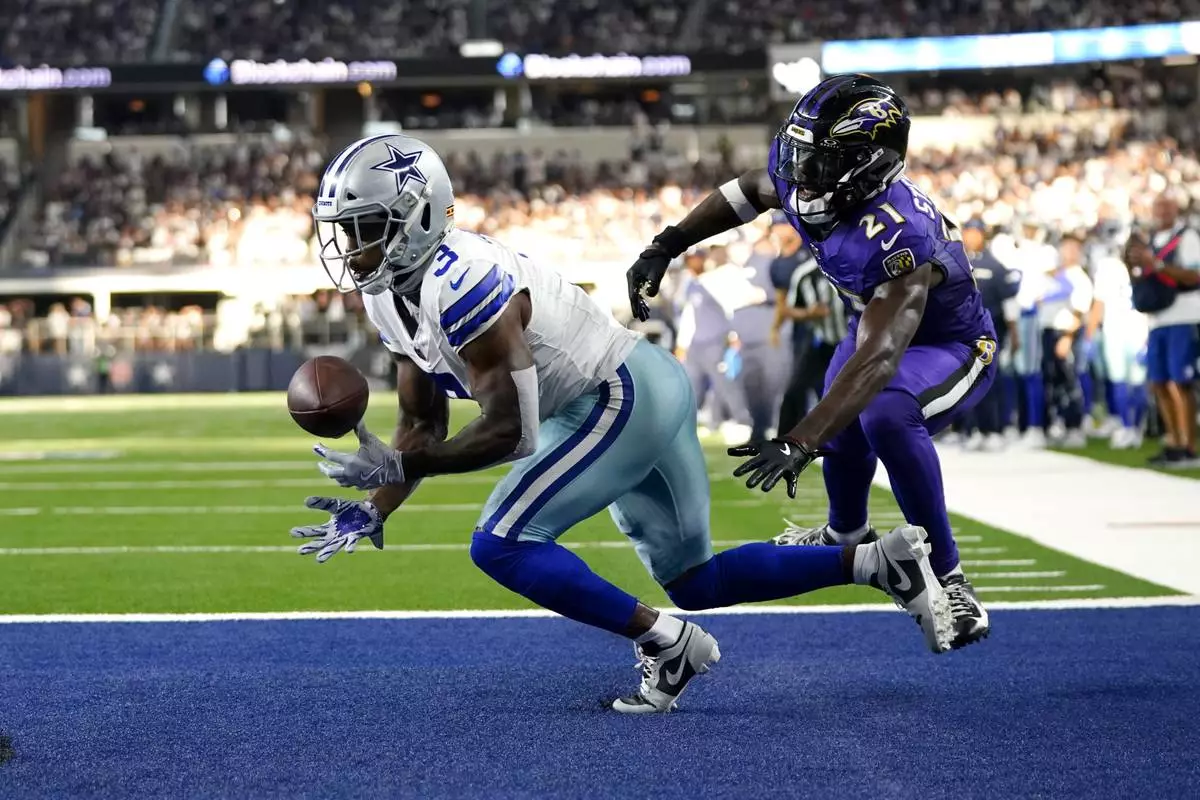 Dallas Cowboys wide receiver Brandin Cooks (3) is uanble to catch a pass in the end zone as Baltimore Ravens cornerback Brandon Stephens (21) defends in the second half of an NFL football game in Arlington, Texas, Sunday, Sept. 22, 2024. (AP Photo/Jeffrey McWhorter)