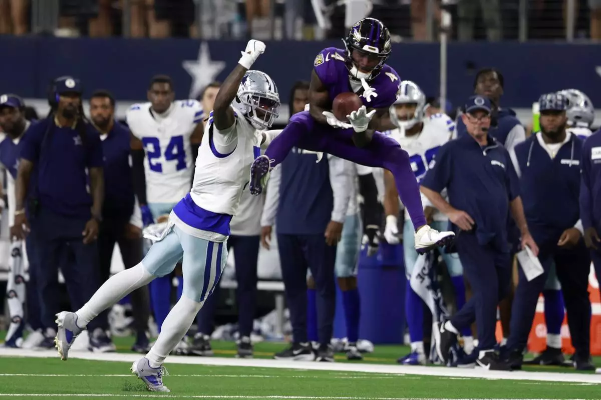 Baltimore Ravens wide receiver Zay Flowers (4) catches a pass as Dallas Cowboys cornerback Trevon Diggs (7) defends late in the second half of an NFL football game in Arlington, Texas, Sunday, Sept. 22, 2024. (AP Photo/Gareth Patterson)