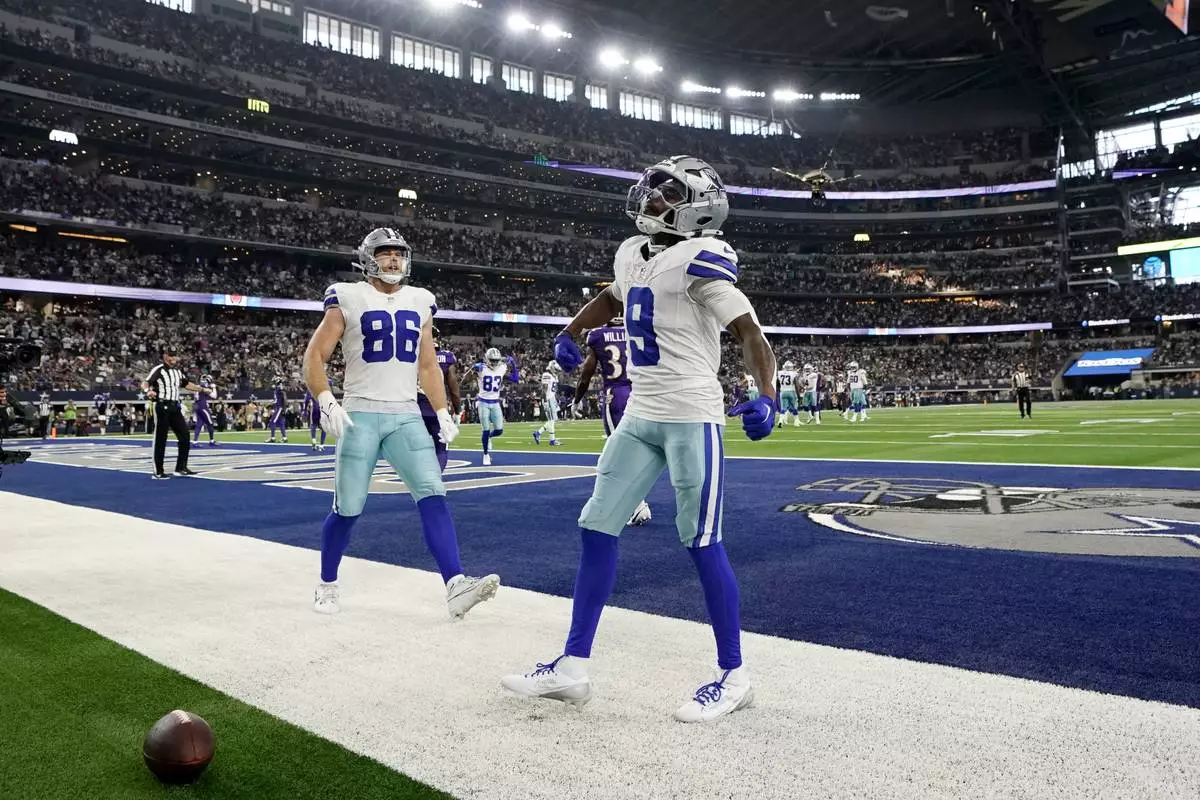 Dallas Cowboys wide receiver KaVontae Turpin (9) celebrates after catching a touchdown pass as tight end Luke Schoonmaker (86) looks on in the second half of an NFL football game against the Baltimore Ravens in Arlington, Texas, Sunday, Sept. 22, 2024. (AP Photo/Jeffrey McWhorter)