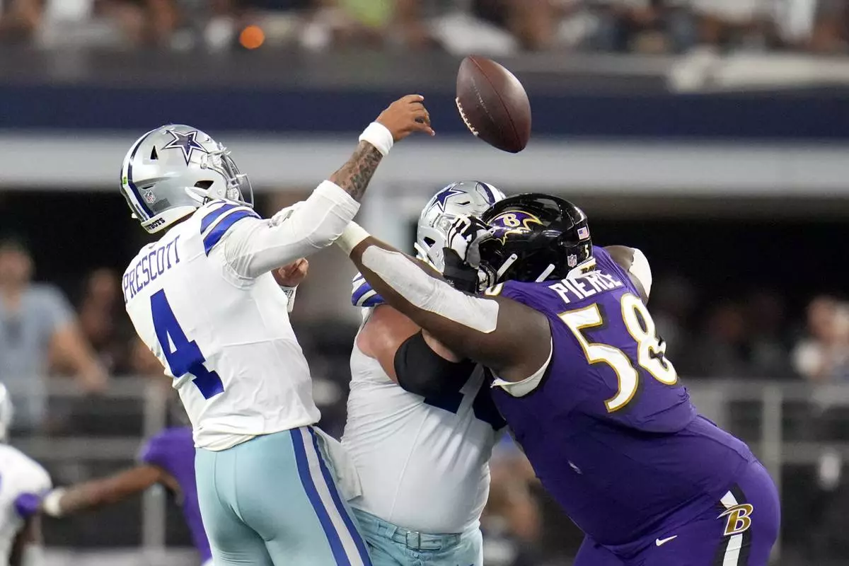 Dallas Cowboys quarterback Dak Prescott (4) is hit trying to throw a pass by Baltimore Ravens defensive tackle Michael Pierce (58) in the second half of an NFL football game in Arlington, Texas, Sunday, Sept. 22, 2024. (AP Photo/Julio Cortez)