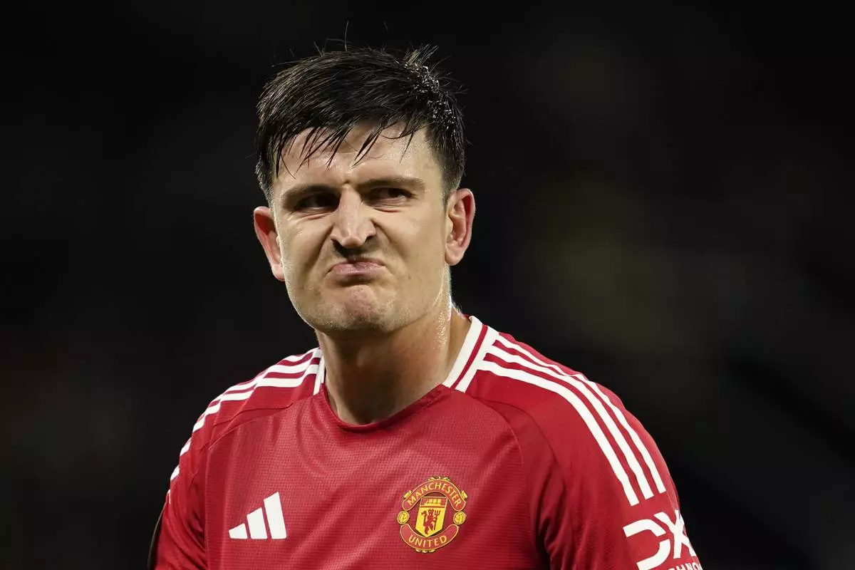 Manchester United's Harry Maguire reacts during the Europa League opening phase soccer match between Manchester United and Twente at the Old Trafford stadium in Manchester, England, Wednesday, Sept. 25, 2024. (AP Photo/Dave Thompson)