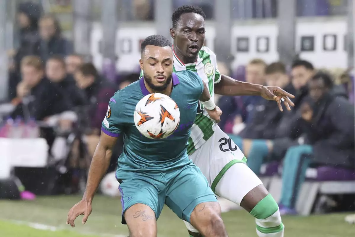 Anderlecht's Mario Stroeykens, left, is challenged by Ferencvaros' Adama Traore during the Europa League soccer match between Anderlecht and Ferencvaros in Anderlecht, Belgium, Wednesday, Sept. 25, 2024. (AP Photo/Francois Walschaerts)