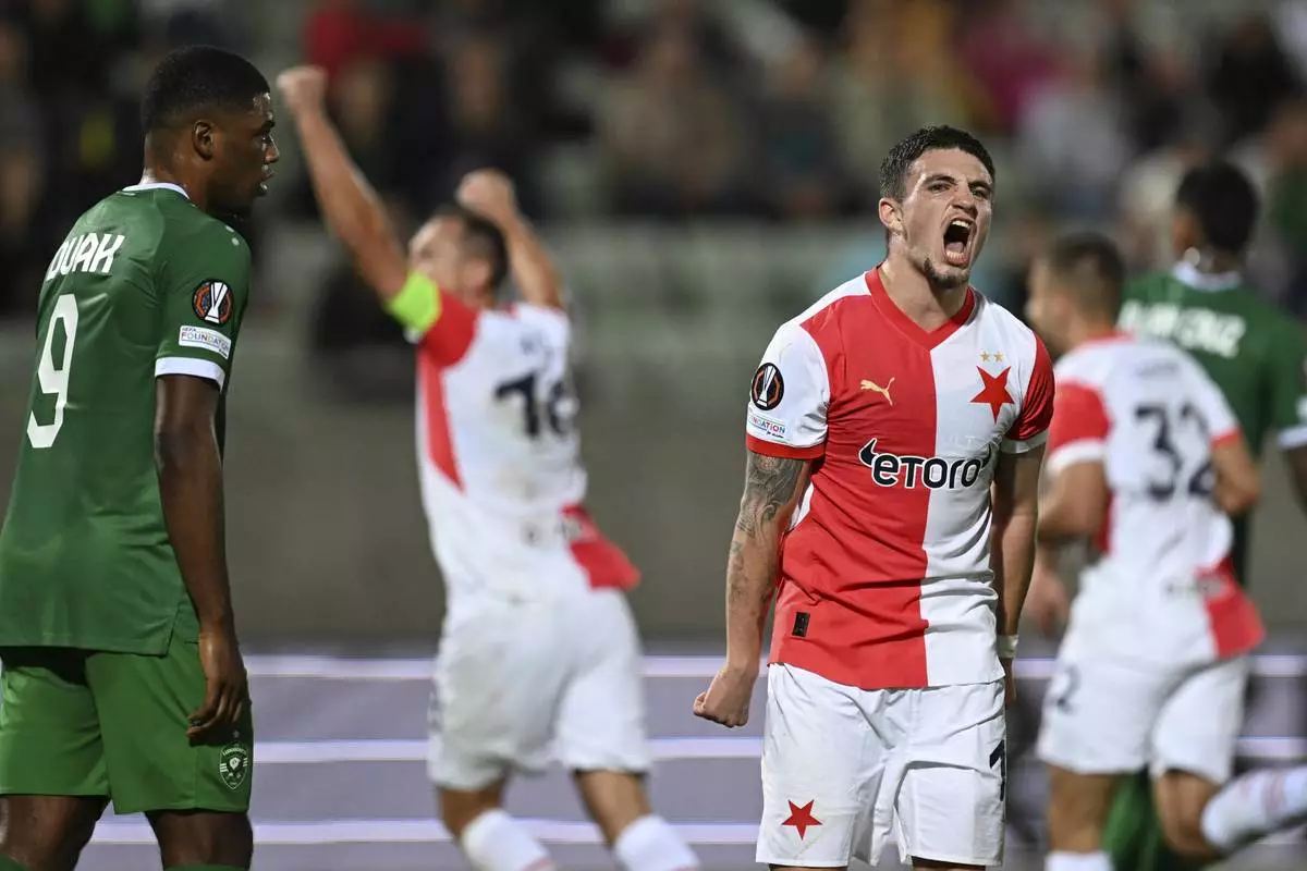 Slavia Praha's Christos Zafeiris reacts after Mojmír Chytil scored his goal against Ludogorets during a Europa League soccer match at Ludogorets Arena, Razgrad, Bulgaria, Wednesday, Sept. 25, 2024. (AP Photo/Tony Uzunov)