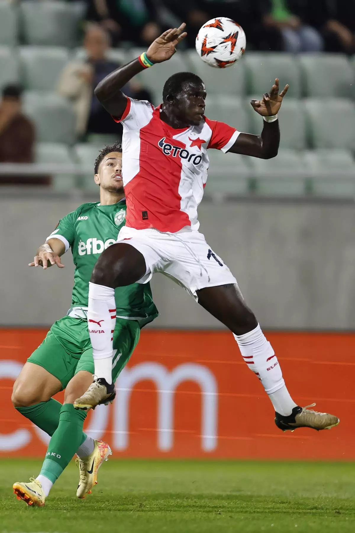 Ludogorets' Caio Vidal, leftt, vies for the ball with Slavia Praha's El Hadji Malick Diouf during their Europa League first match of the main phase, at Ludogorets Arena, Razgrad, Bulgaria, Wednesday, Sept. 25, 2024. (AP Photo/Tony Uzunov)