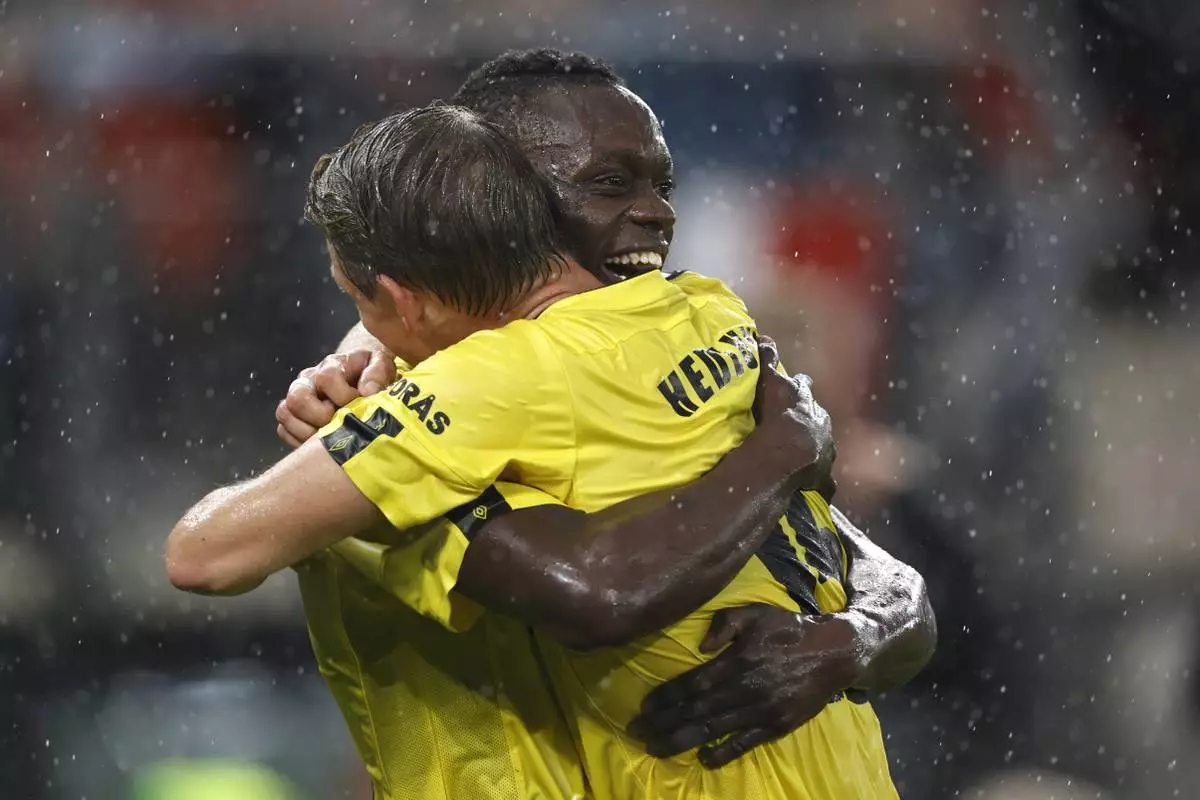 Elfsborg's Timothy Ouma, right, celebrates with Elfsborg's Simon Hedlund after scoring his side's opening goal during the Europa League soccer match between AZ Alkmaar and Elfsborg at the AFAS stadium, in Alkmaar, Netherlands, Wednesday, Oct. 25, 2024. (AP Photo/Maurice van Steen)