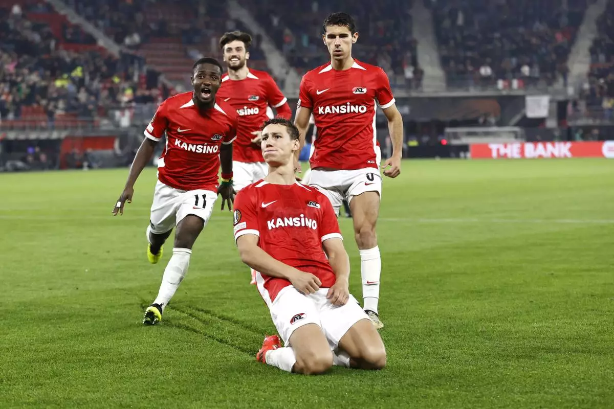 AZ Alkmaar's Ruben van Bommel, centre, celebrates after scoring his side's second goal during the Europa League soccer match between AZ Alkmaar and Elfsborg at the AFAS stadium, in Alkmaar, Netherlands, Wednesday, Oct. 25, 2024. (AP Photo/Maurice van Steen)