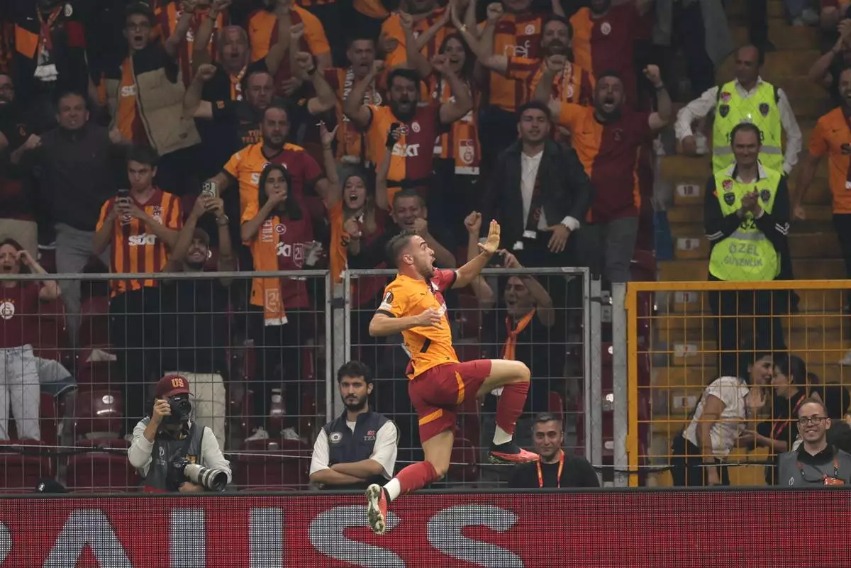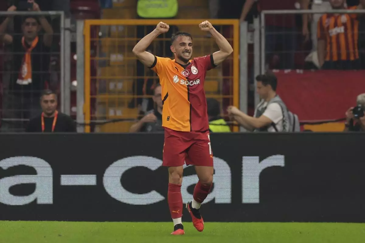 Galatasaray's Yunus Akgun, celebrates a goal during the Europa League opening phase soccer match between Galatasaray and PAOK at the Ali Sami Yen stadium in Istanbul, Turkey, Wednesday, Sept. 25, 2024. (AP Photo)