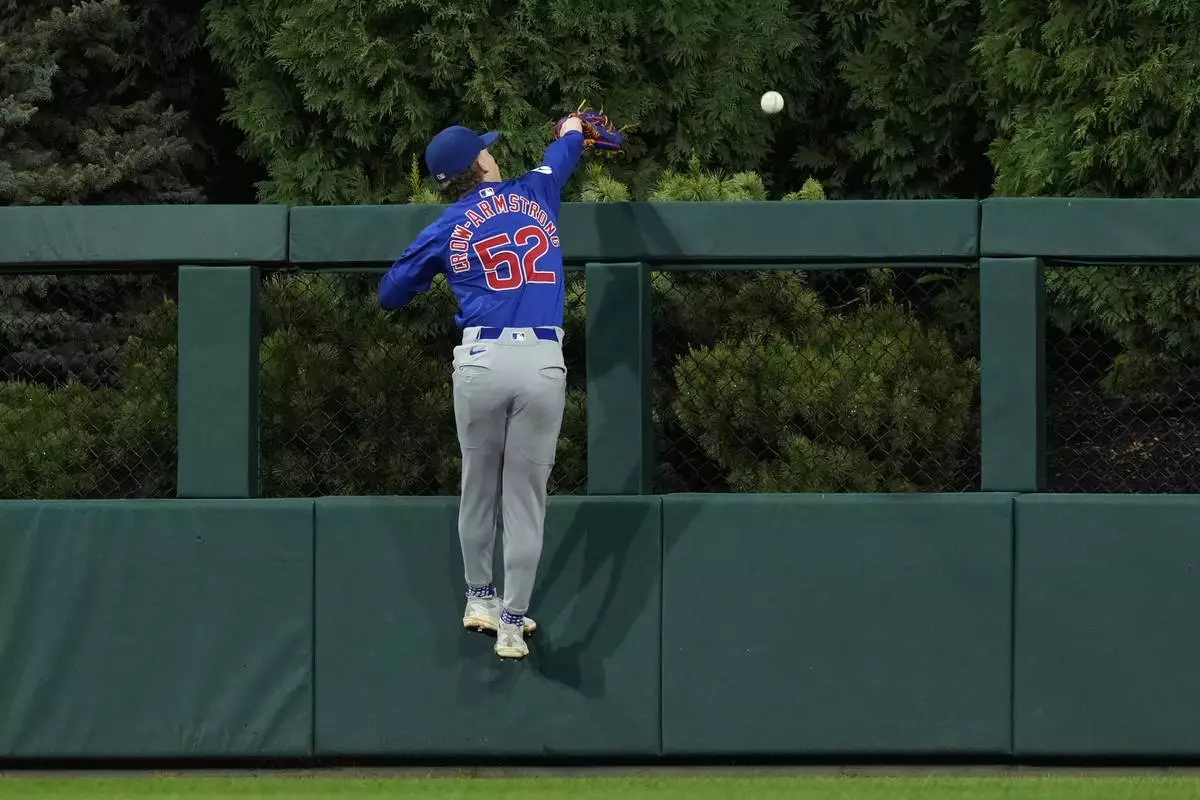 Chicago Cubs center fielder Pete Crow-Armstrong cannot reach a home run by Philadelphia Phillies' Kody Clemens during the fourth inning of a baseball game, Wednesday, Sept. 25, 2024, in Philadelphia. (AP Photo/Matt Slocum)