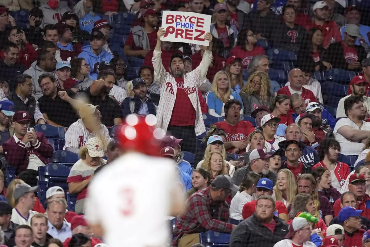 A fan cheers for Philadelphia Phillies' Bryce Harper during the eighth inning of a baseball game against the Chicago Cubs, Wednesday, Sept. 25, 2024, in Philadelphia. (AP Photo/Matt Slocum)
