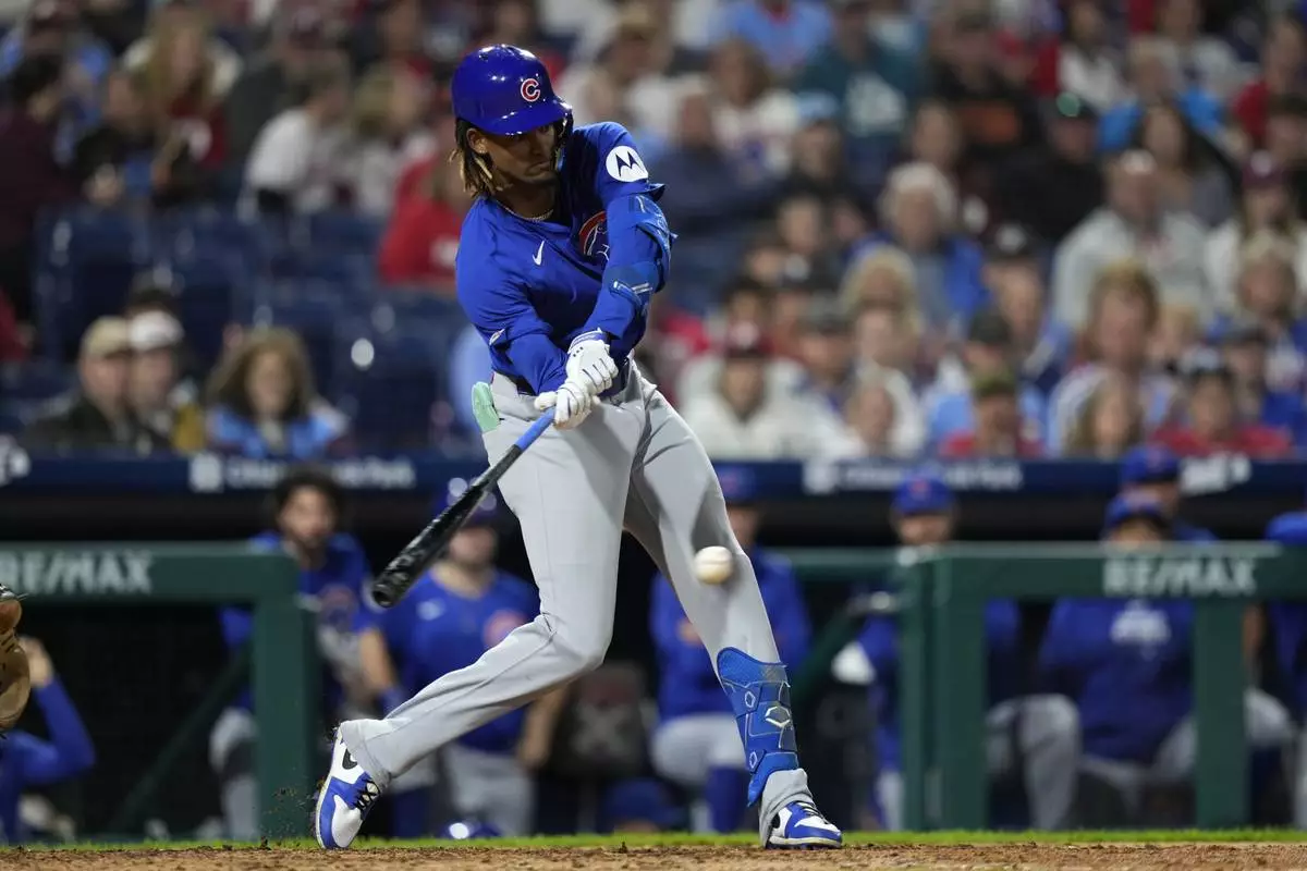 Chicago Cubs' Kevin Alcantara hits a single against Philadelphia Phillies pitcher Carlos Estévez during the ninth inning of a baseball game, Wednesday, Sept. 25, 2024, in Philadelphia. (AP Photo/Matt Slocum)