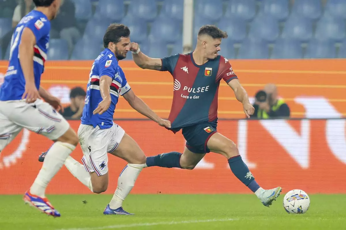 Genoa's Mattia Bani, left, shields the ball from Sampdoria's Massimo Coda during an Italian Cup soccer match between Genoa and Sampdoria at Luigi Ferraris Stadium, Wednesday, Sept. 25, 2024, in Genoa, Italy. (Tano Pecoraro/LaPresse via AP)
