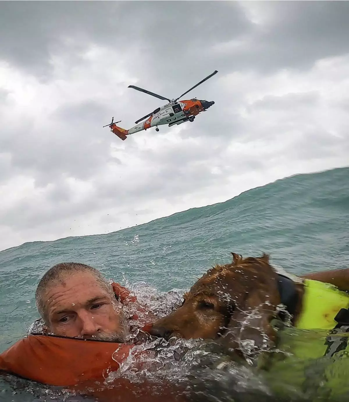 This photo provided by U.S. Coast Guard District Seven (USCGSoutheast) shows a man and his dog being rescued after his sailboat became disabled during Hurricane Helene approximately 25 miles off Sanibel Island, Fla., on Thursday, Sept. 26, 2024. (U.S. Coast Guard District Seven via AP)