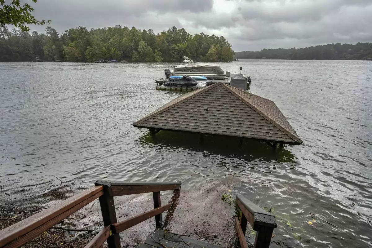 Torrential rain from Hurricane Helene has caused lake levels to rise on Lake James, resulting in flooded docks and gazebos, Friday, Sept. 27, 2024 in Morganton, N.C. (AP Photo/Kathy Kmonicek)
