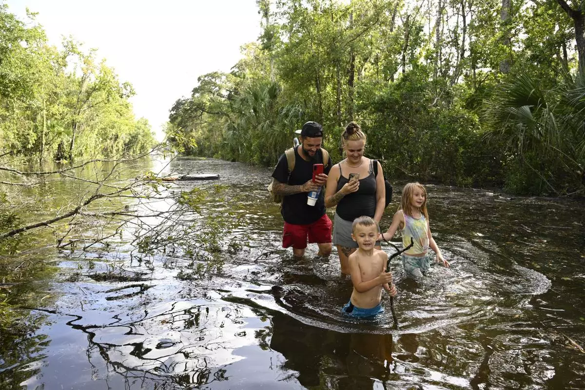 Dustin Holmes, rear left, his girlfriend Hailey Morgan, and her children Aria Skye Hall, 7, right, and Kyle Ross, 4, walk through a flooded road while returning to their home after Hurricane Helene passed near the area, Friday, Sept. 27, 2024, in Crystal River, Fla. (AP Photo/Phelan M. Ebenhack)
