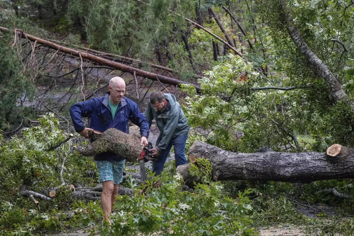 Chris Elder carries sections of a fallen tree as neighbor, Mike Cioffoletti works a chain saw to cut down a large tree that fell over Sandy Cove Drive, after Hurricane Helene passed the area Friday, Sept. 27, 2024 in Morganton, N.C. (AP Photo/Kathy Kmonicek)