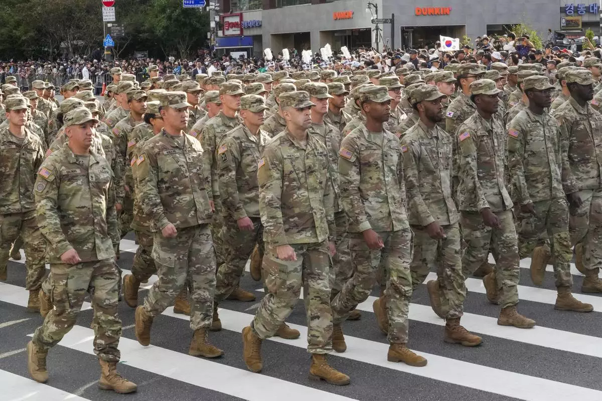 U.S. Army soldiers take part in a parade during the 76th Armed Forces Day ceremony in Seoul, South Korea, Tuesday, Oct. 1, 2024. (AP Photo/Ahn Young-joon)