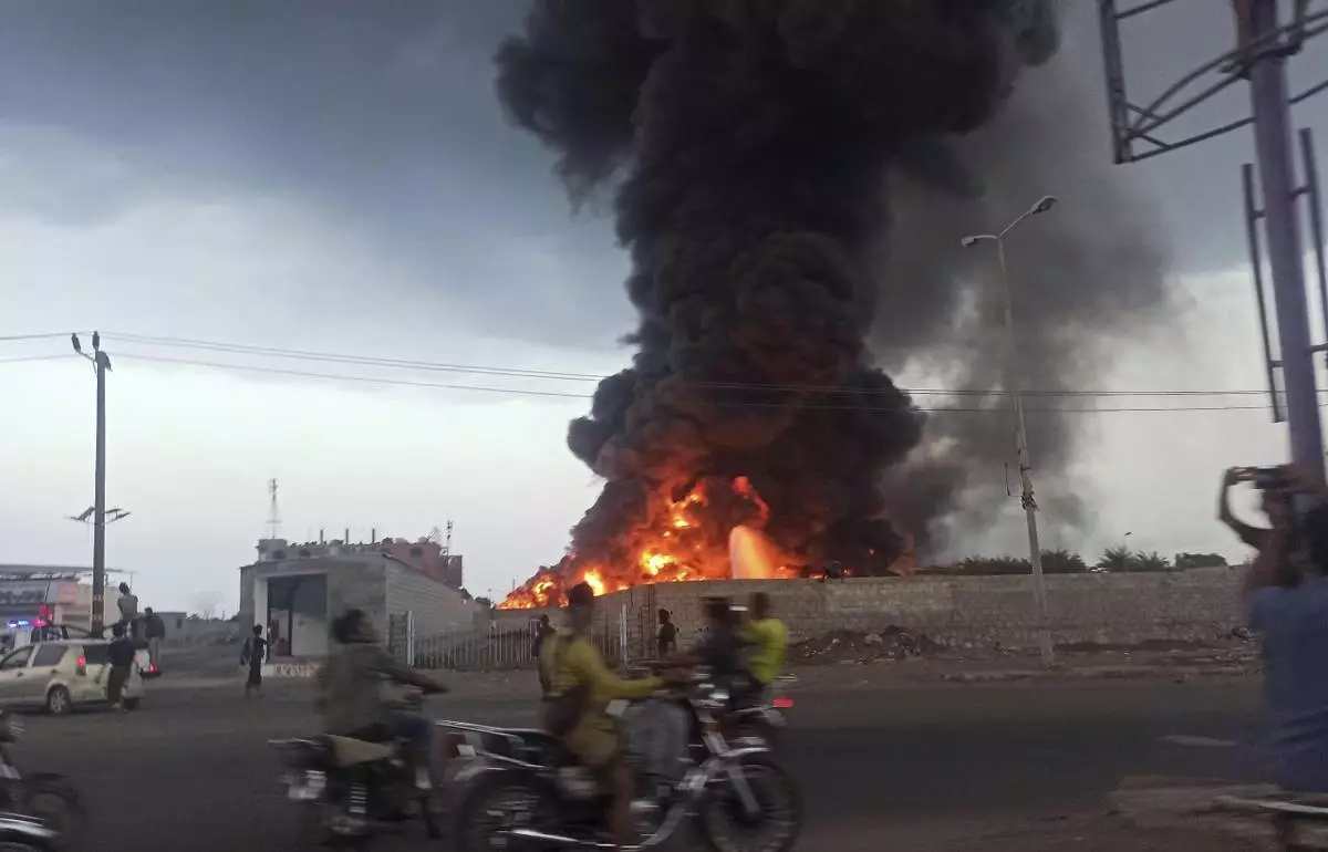 A large fire and plume of smoke is visible in the port city of Hodeida, Yemen, on Sunday, Sept. 29, 2024, after Israeli strikes on the Houthi-controlled city. (AP Photo)