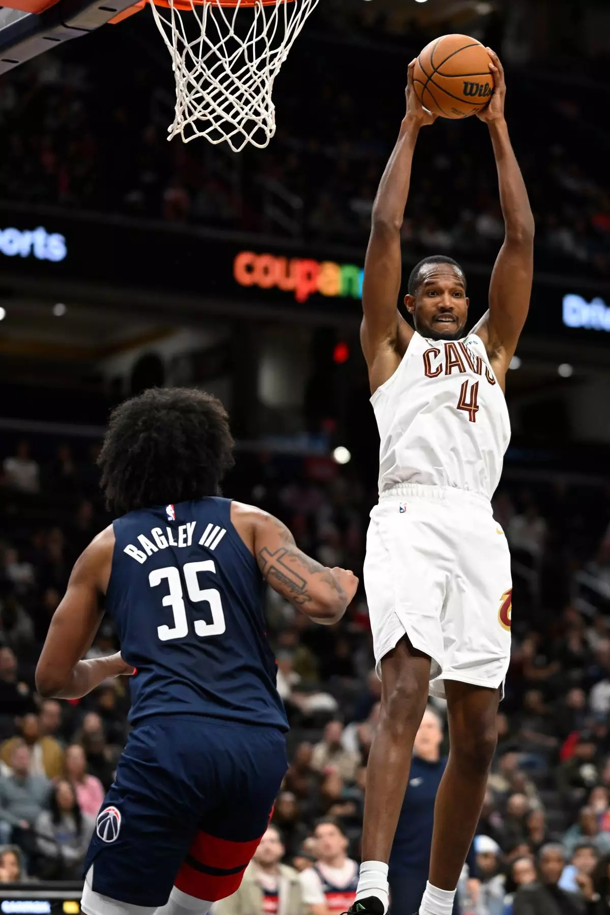 Cleveland Cavaliers center Evan Mobley (4) grabs a rebound over Washington Wizards forward Marvin Bagley III (35) during the second half of an NBA basketball game Friday, Dec. 12, 2025, in Washington. (AP Photo/John McDonnell)