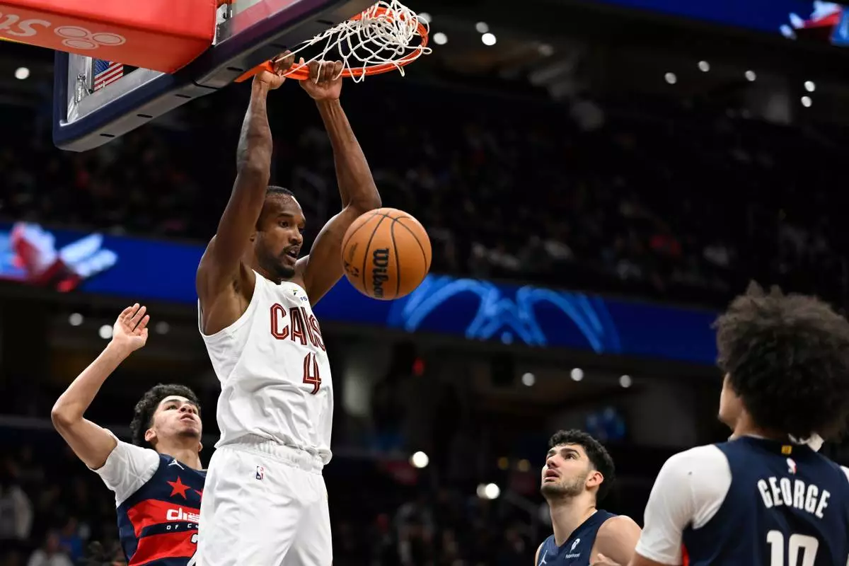 Cleveland Cavaliers center Evan Mobley (4) dunks during the first half of an NBA basketball game against the Washington Wizards, Friday, Dec. 12, 2025, in Washington. (AP Photo/John McDonnell)