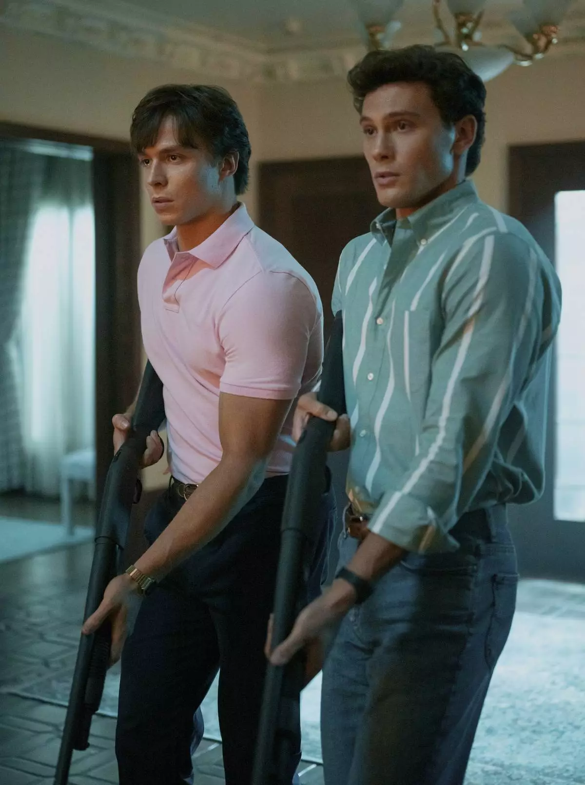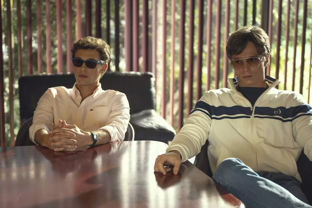 This image released by Netflix shows Cooper Koch as Erik Menendez, left, and Nicholas Chavez as Lyle Menendez in a scene from "Monsters: The Lyle And Erik Menendez Story." (Miles Crist/Netflix via AP)