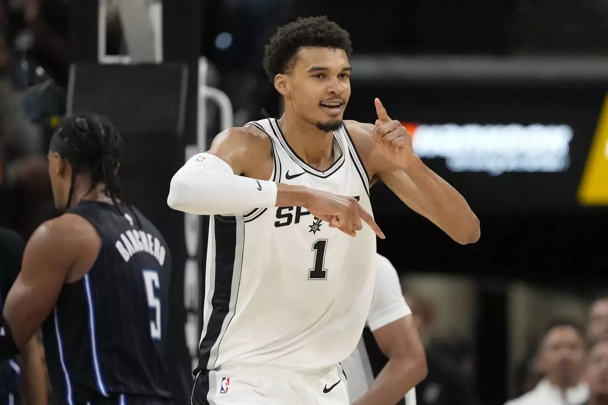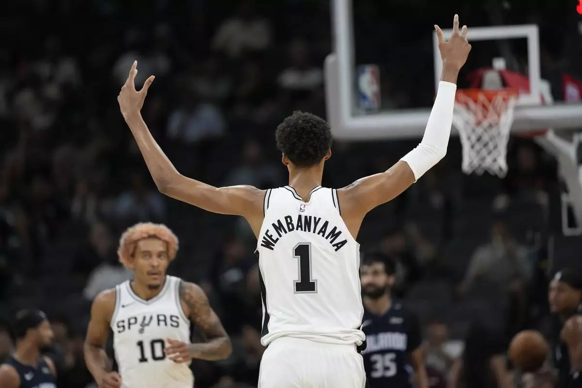 San Antonio Spurs center Victor Wembanyama (1) reacts to a score against the Orlando Magic during the first half of a preseason NBA basketball game in San Antonio, Wednesday, Oct. 9, 2024. (AP Photo/Eric Gay)