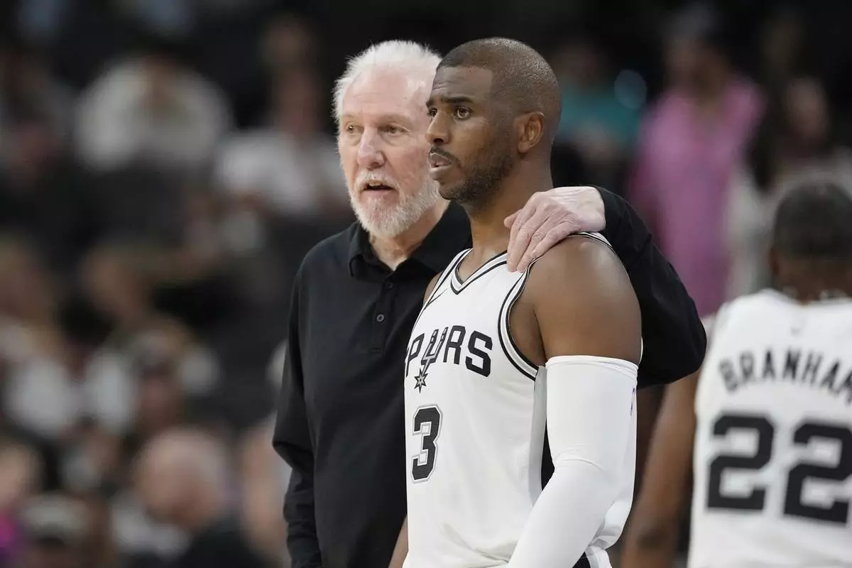 San Antonio Spurs head coach Gregg Popovich, left, talks with guard Chris Paul (3) during the first half of a preseason NBA basketball game against the Orlando Magic in San Antonio, Wednesday, Oct. 9, 2024. (AP Photo/Eric Gay)