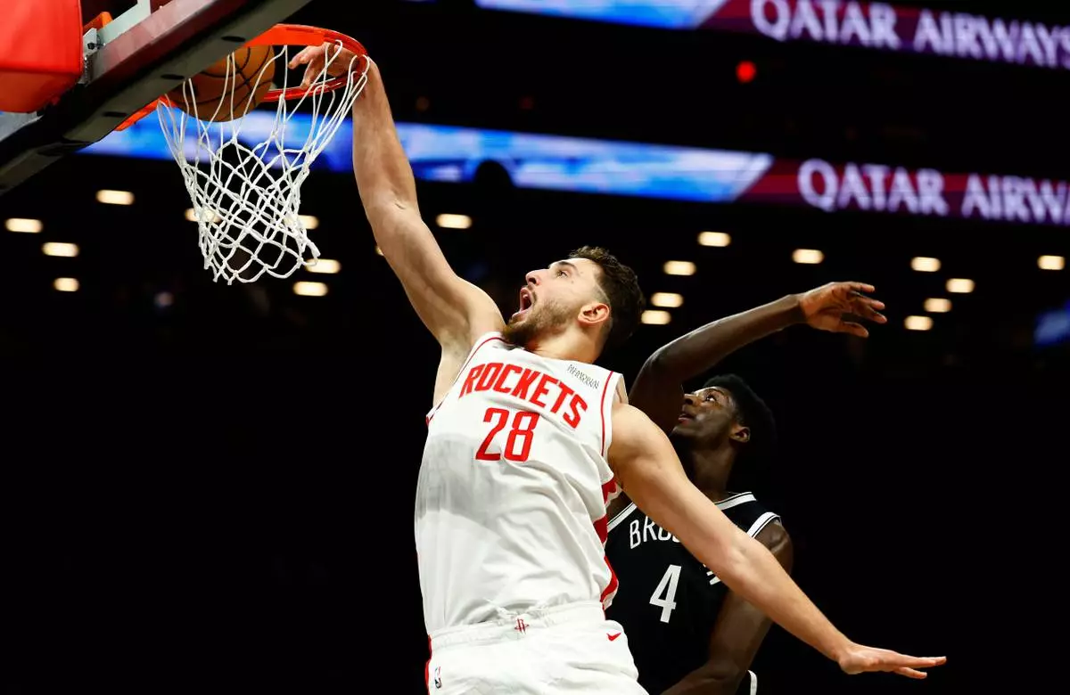 Houston Rockets center Alperen Sengun (28) dunks against Brooklyn Nets guard Drake Powell (4) during the first half of an NBA basketball game, Thursday, Jan. 1, 2026, in New York. (AP Photo/Noah K. Murray)