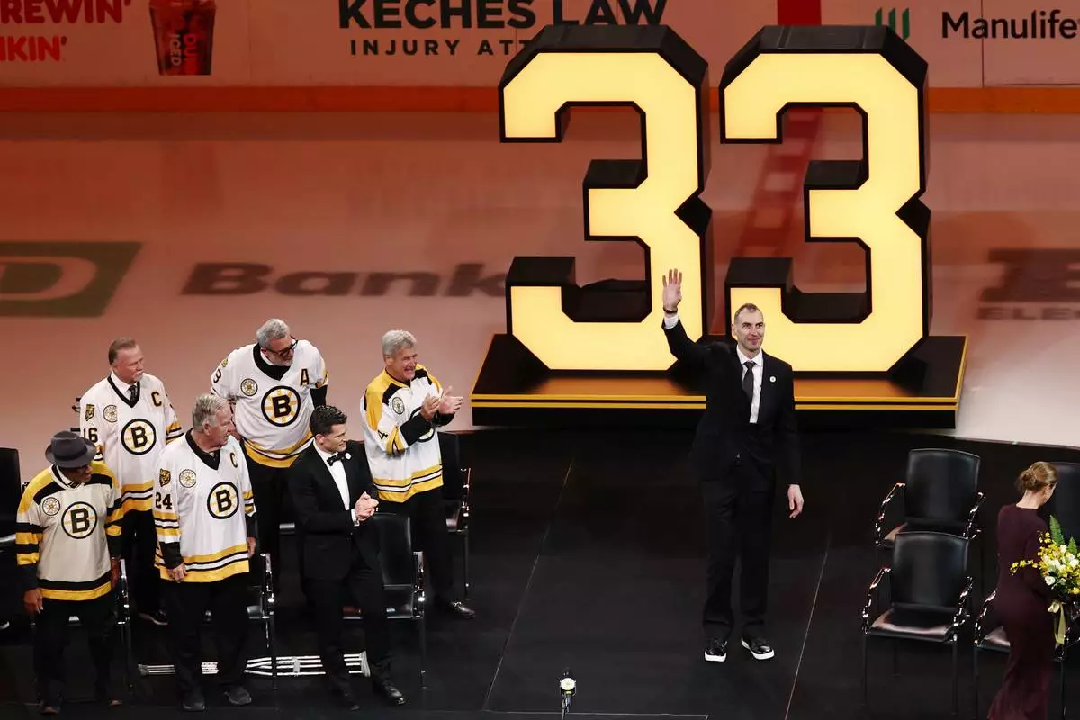 Former Boston Bruins captain Zdeno Chara, center, waves to the crowd during his number retirement ceremony, as Bruins' players with their number already retired, from left, Willie O'Ree, Rick Middleton, Terrry O'Reilly, Cam Neely, emcee Andrew Ferrance and Bobby Orr look on before an NHL hockey game between the Boston Bruins and the Seattle Kraken, Thursday, Jan. 15, 2026, in Boston. (AP Photo/Winslow Townson)