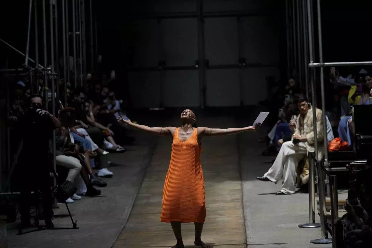 A model recites poetry during the presentation of the As Marias collection at the Oficina Theater during Sao Paulo Fashion Week in Sao Paulo, Brazil, Friday, Oct. 18, 2024. (AP Photo/Andre Penner)