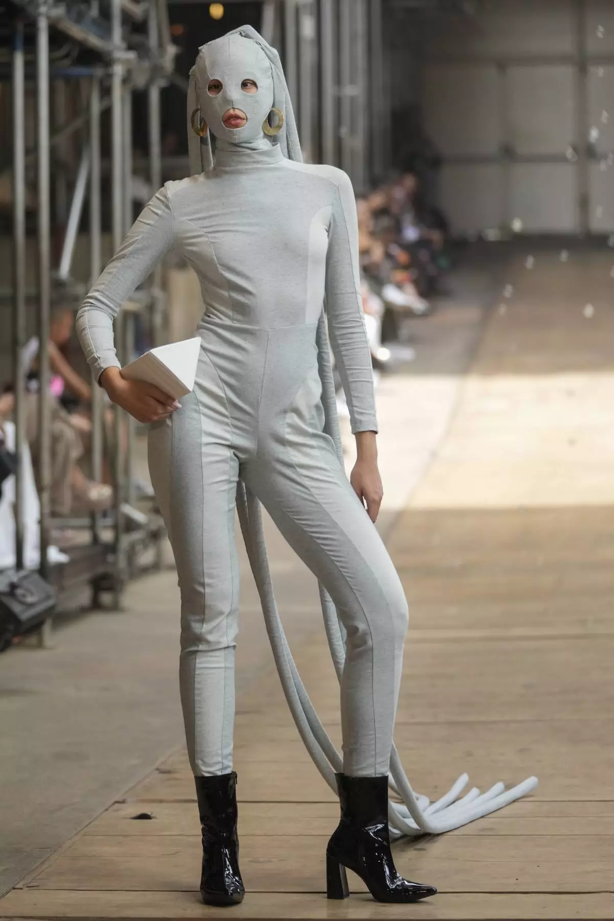 A model takes off her shoes while on the catwalk during the presentation of the Cria Costura collection at Sao Paulo Fashion Week in Sao Paulo, Thursday, Oct. 17, 2024. (AP Photo/Andre Penner)