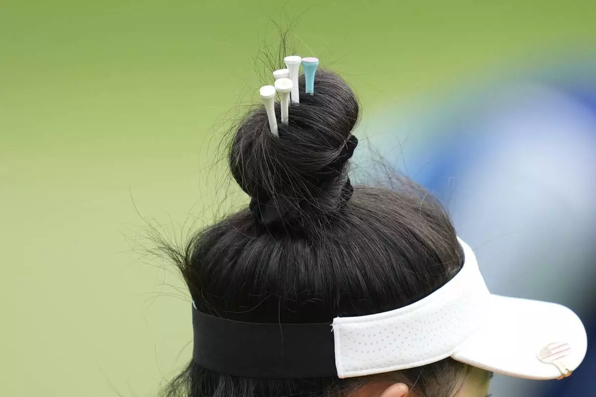 Lucy Li, of the United States has tees in her hair on the 5th green during the third round of the LPGA Ladies Championship golf tournament at the Seowon Valley Country Club in Paju, South Korea, Saturday, Oct. 19, 2024. (AP Photo/Lee Jin-man)