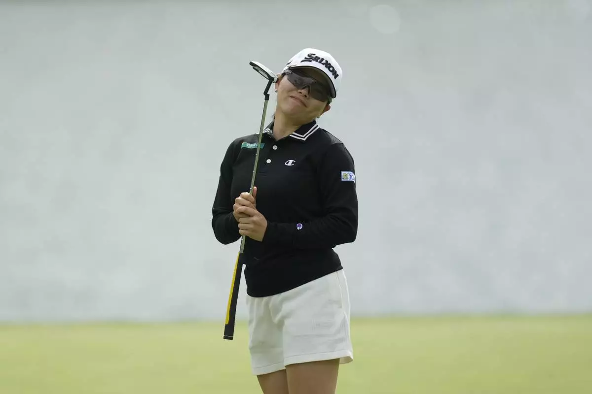 Minami Katsu of Japan reacts after missing a putt on the 5th green during the third round of the LPGA Ladies Championship golf tournament at the Seowon Valley Country Club in Paju, South Korea, Saturday, Oct. 19, 2024. (AP Photo/Lee Jin-man)