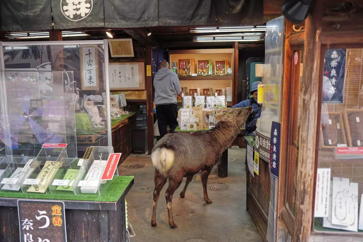 A deer walks into a shop at a park in Nara, western Japan, Wednesday, Jan. 14, 2026, where more than 1,000 free-roaming deer considered sacred in Shinto belief have become one of the city's most popular tourist attractions. (AP Photo/Eugene Hoshiko)