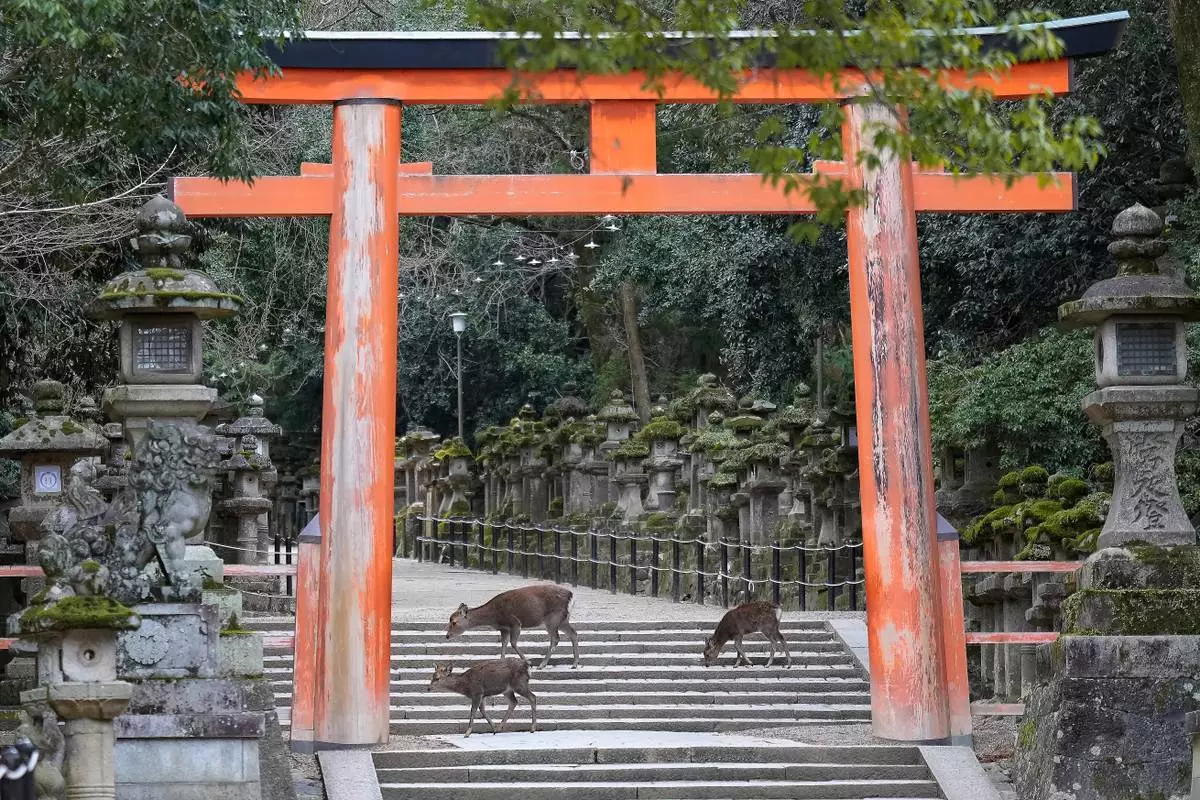Deer stroll at a Torii shrine gate at Kasuga Taisha shrine in Nara, western Japan, Wednesday, Jan. 14, 2026, where more than 1,000 free-roaming deer considered sacred in Shinto belief have become one of the city's most popular tourist attractions. (AP Photo/Eugene Hoshiko)