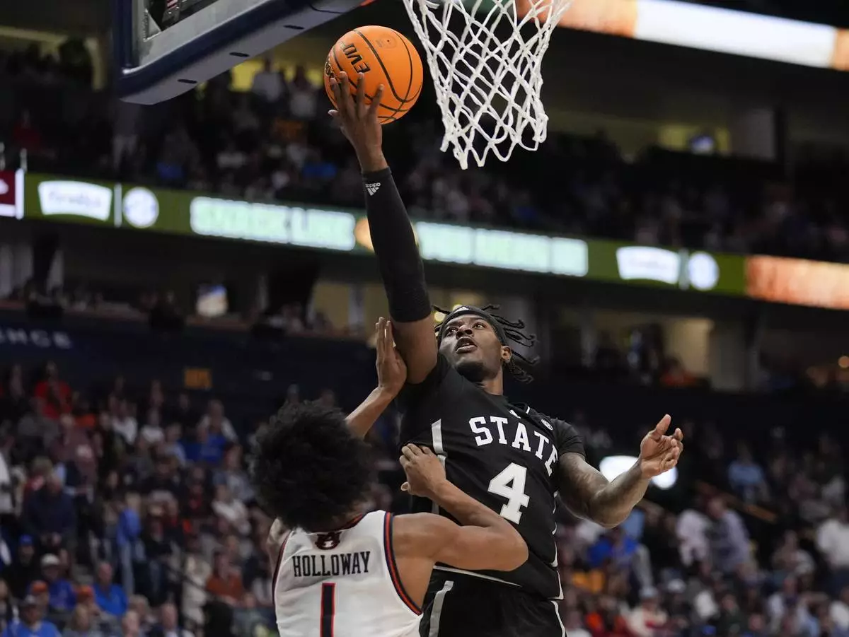 FILE - Mississippi State forward Cameron Matthews (4) shoots as Auburn guard Aden Holloway (1) defends during the first half of an NCAA college basketball game at the Southeastern Conference tournament, March 16, 2024, in Nashville, Tenn. (AP Photo/John Bazemore, File)